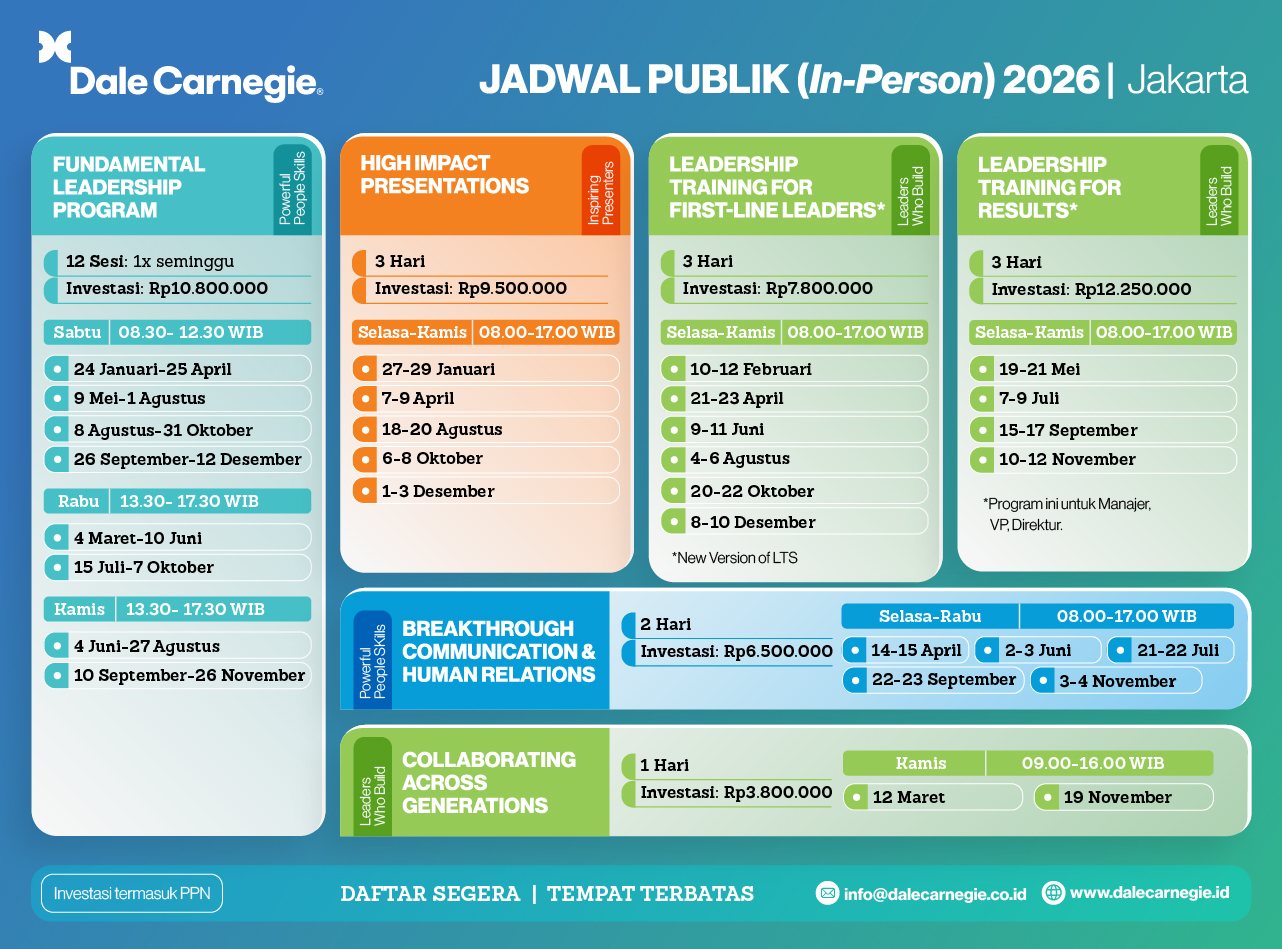 24 Jan 25 Apr Fundamental Leadership Program – In-Person Saturday, Jakarta (location will be informed) EVENT DETAIL