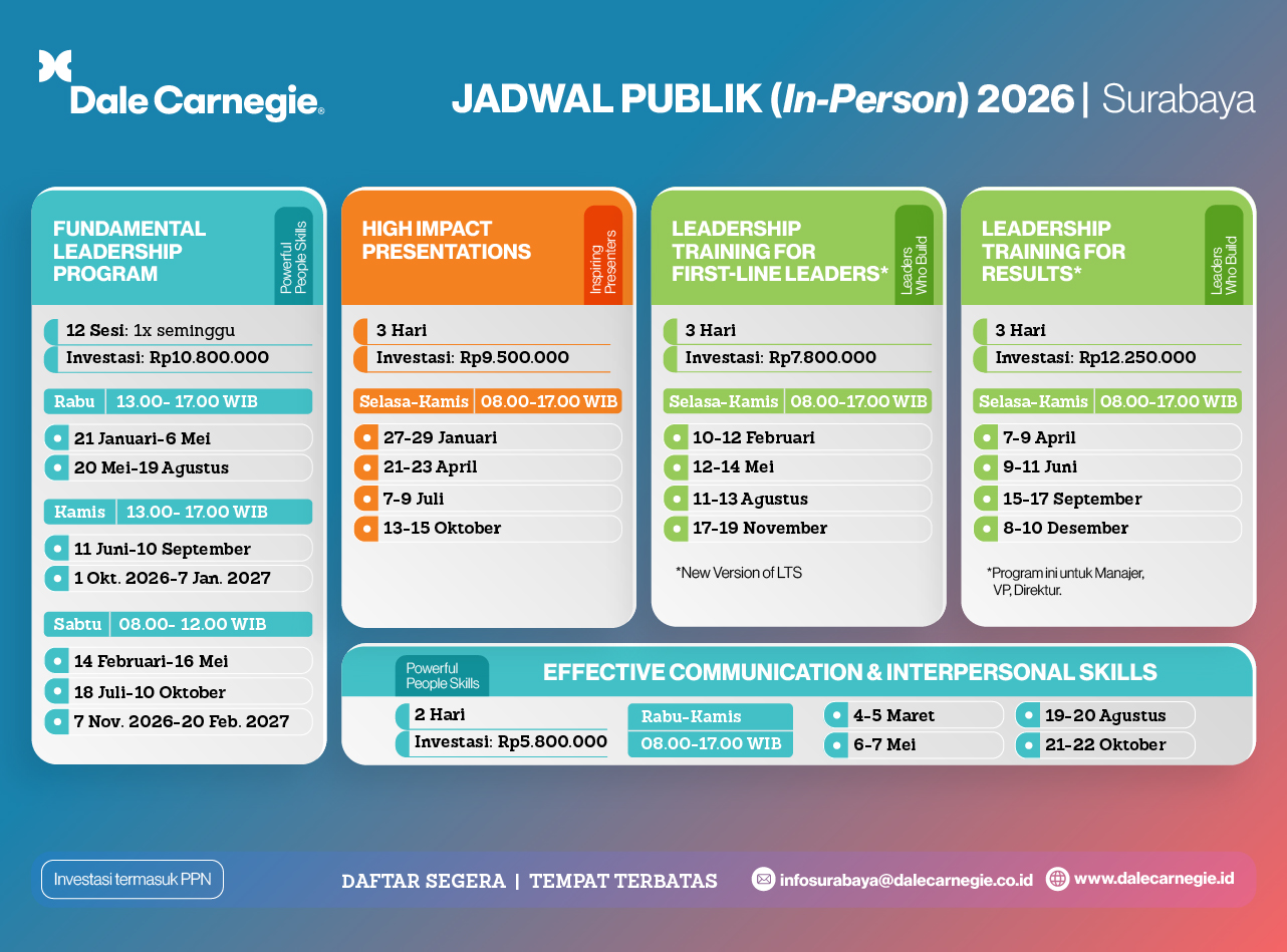 01 Oct 07 Jan Fundamental Leadership Program – In-Person Thursday, Surabaya (location will be informed) EVENT DETAIL