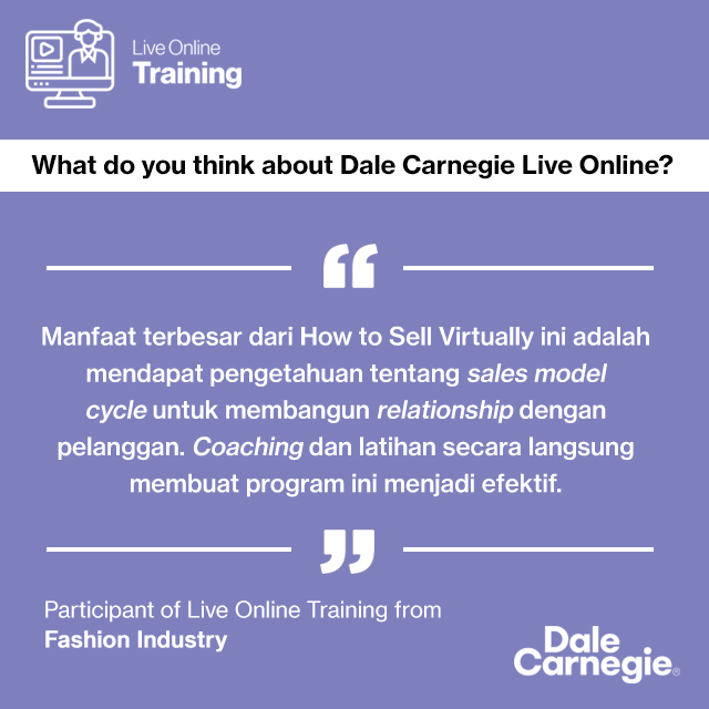 Ikutlah Dale Carnegie Live Online Training “How to Sell Virtually” untuk mempelajari cara membangun komunikasi penjualan yang berkelanjutan dan bermakna secara online.